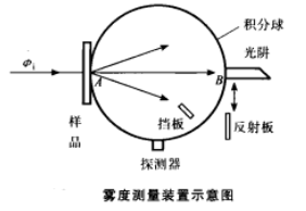 霧度和透光率是透明薄膜材料兩項重要的指標。霧度(也稱朦朧度)H還是入射光透過樣品后偏離入射方向一定角度以上的漫透射通量與總透射通量的比值。霧度常用于描述透明薄膜材料的漫射特性。對漫透射光偏離入射光的角度一般規定為大于2.5,但是也有規定為其他角度的。ASTM D1003中對有關霧度測定、顯示方法做了詳細規定。